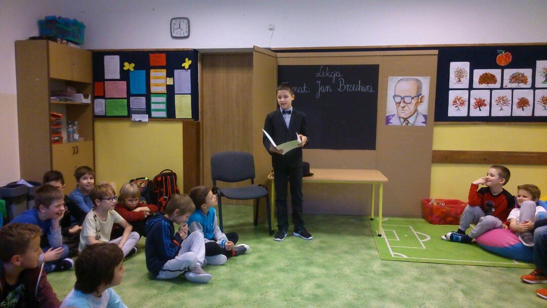 Trzecia klasa, w ramach próby generalnej przed odegraniem jej na III Festiwalu Form Teatralnych, wystąpiła dla świetlicy w inscenizacji „Chrząszcz” . Oglądaliśmy te przedstawienie z zainteresowaniem i podziwem dla naszych kolegów.