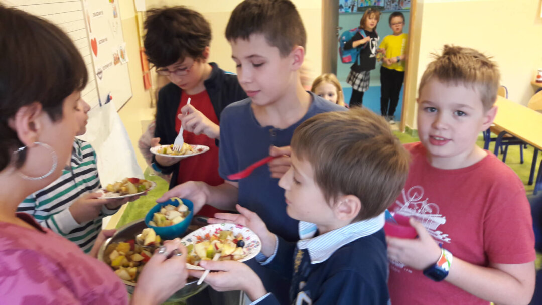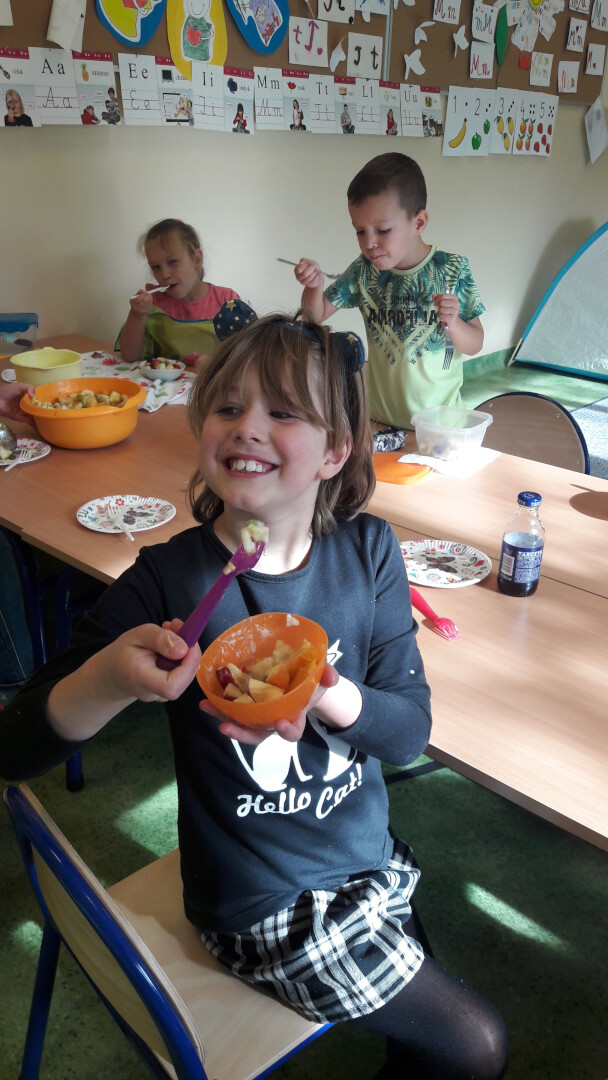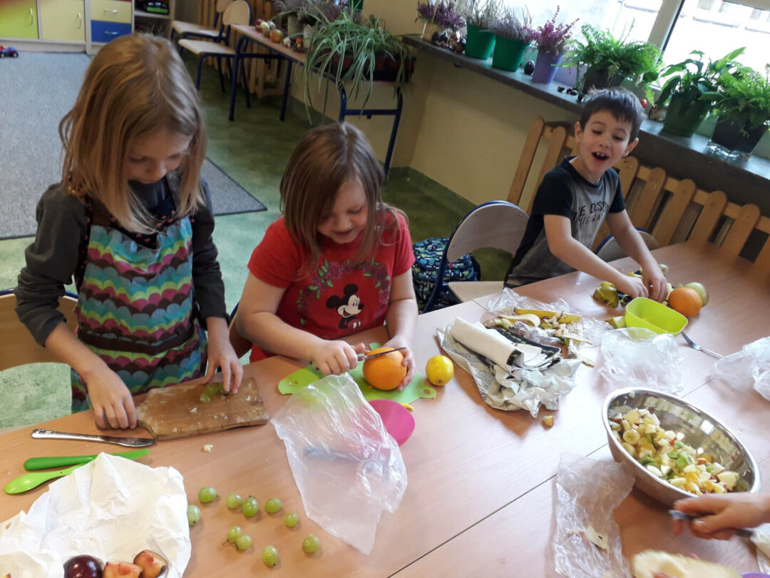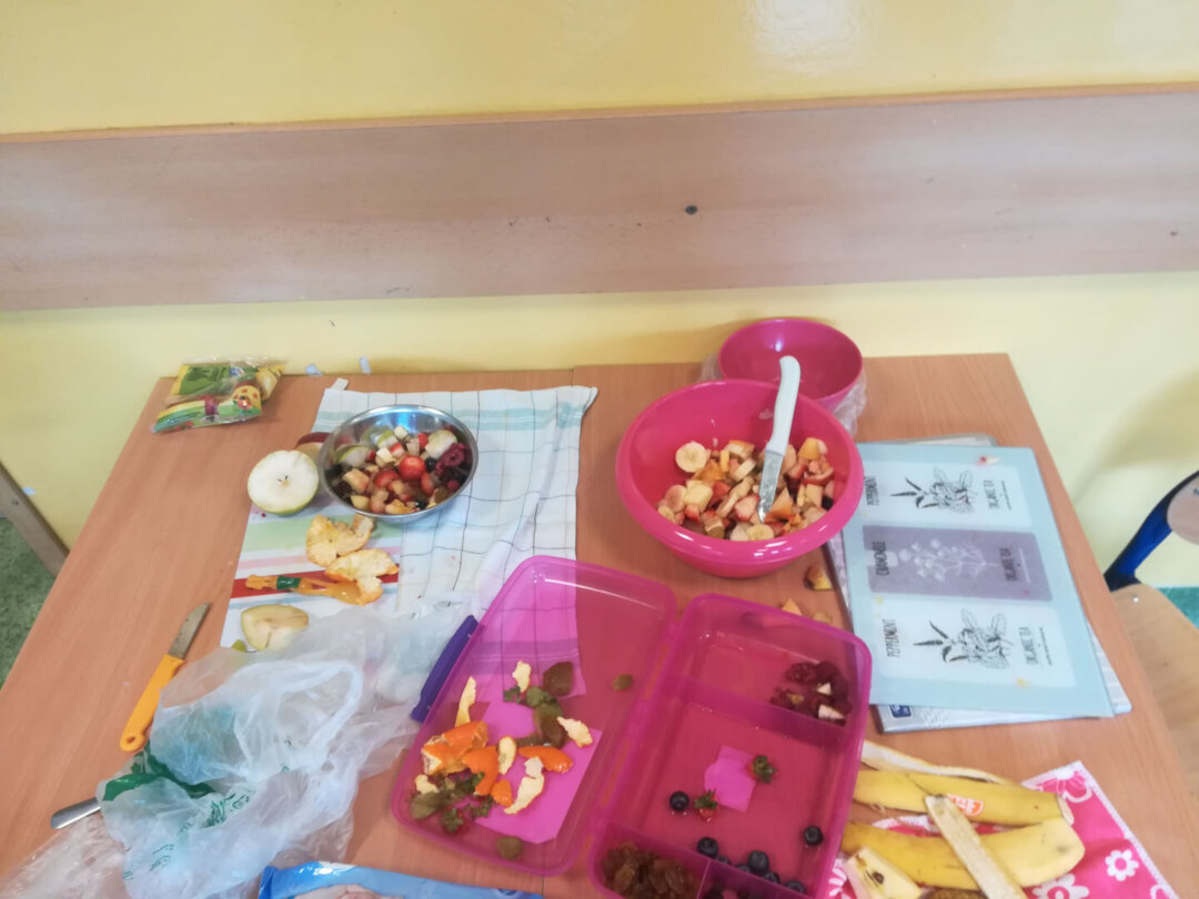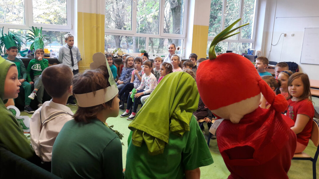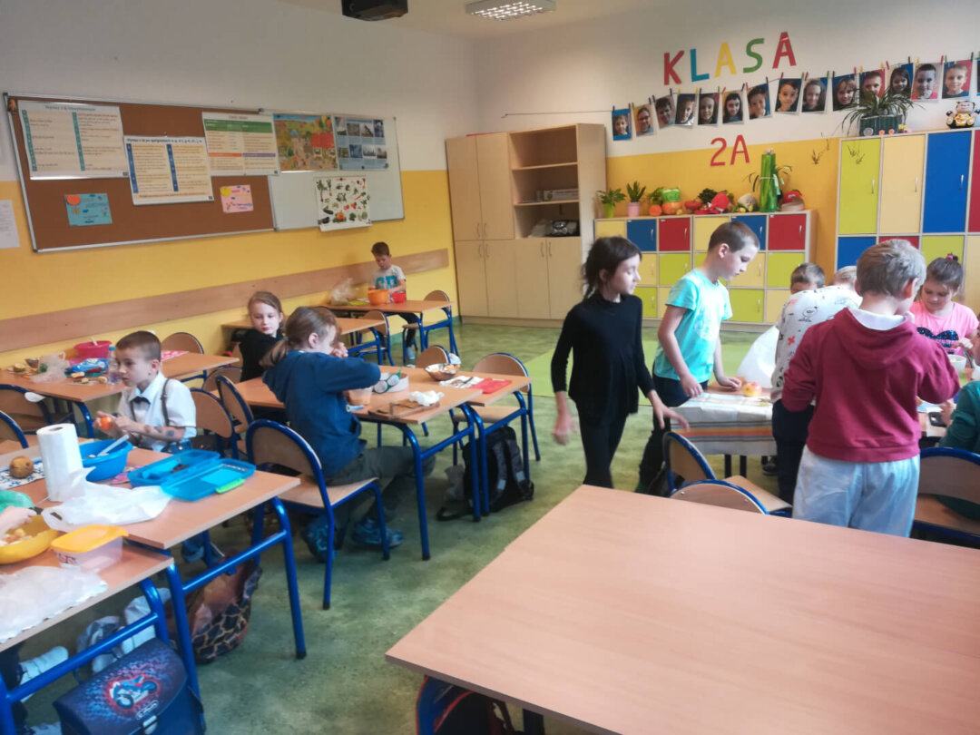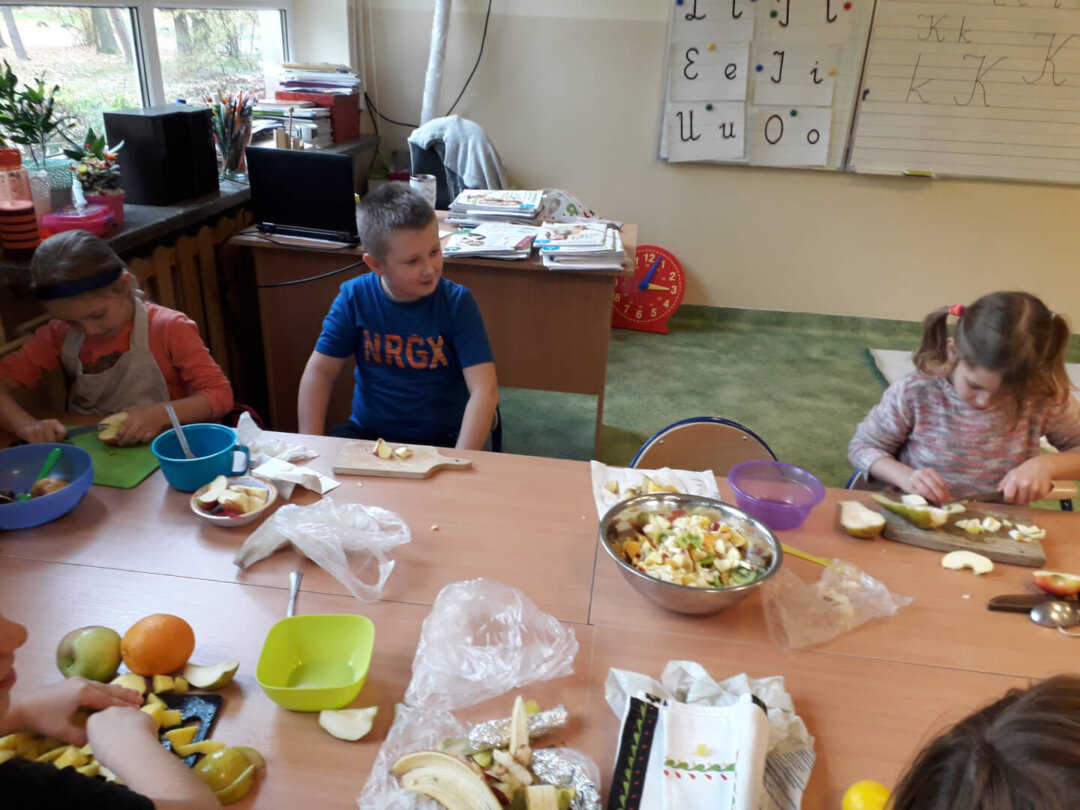 Celem programu jest uświadomienie dzieciom wpływu odpowiedniego żywienia na ich zdrowie. A nic tak nie uczy jak działanie! Pierwsze zajęcia poświęcone były PIRAMIDZIE ŻYWIENIA. Dzieci nie tylko słuchały i rozmawiały na ten temat, przede wszystkim same zbudowały „schody zdrowia”. Drugie zajęcia rozpoczęliśmy przygotowanym przez uczniów klasy 2a występem pt. „Na straganie”. Inscenizacja była wspaniała! Drugoklasiści to świetni aktorzy! Później każdy aktor opowiedział o granym przez siebie warzywie. Dzięki temu dowiedzieliśmy się ile cennych witamin i minerałów zawierają jarzynki 🙂 Następnie nadszedł czas działania! W klasach przygotowaliśmy pyszne