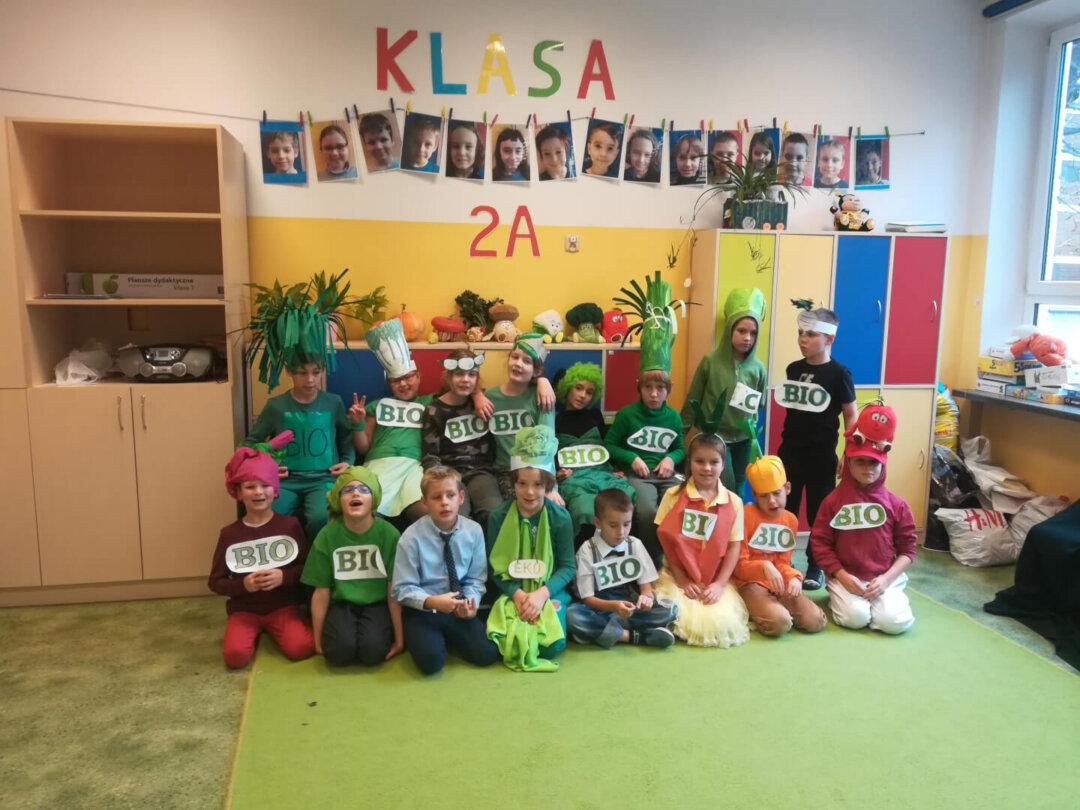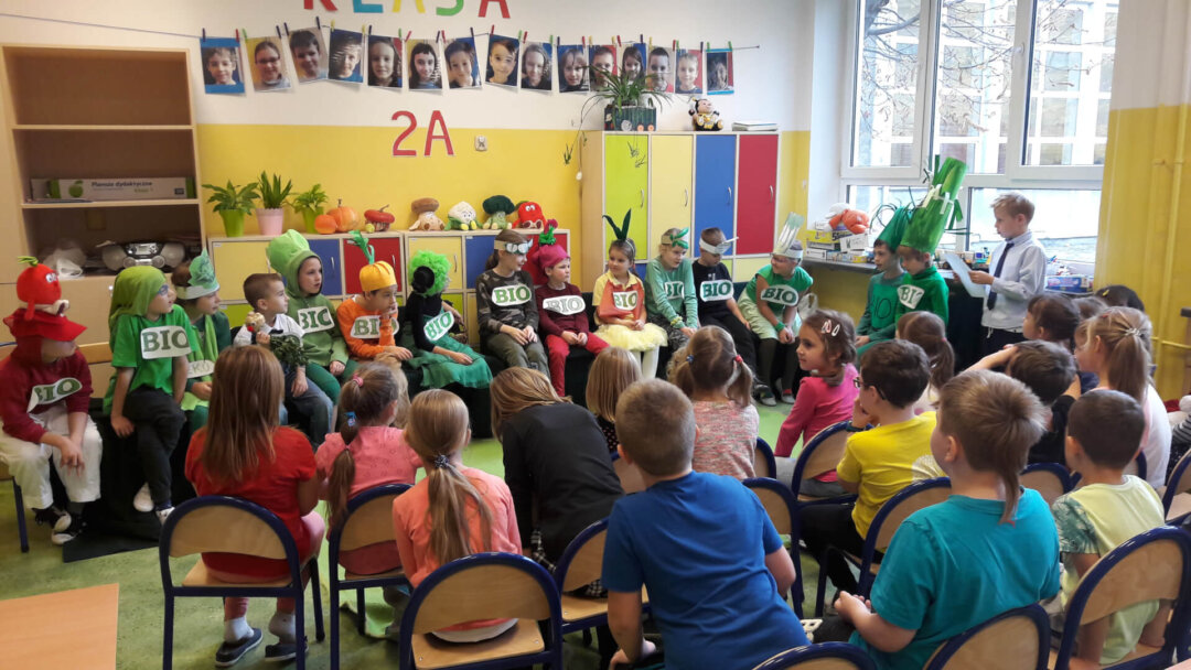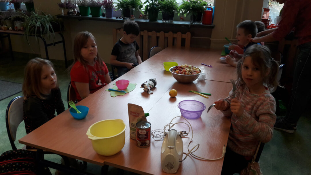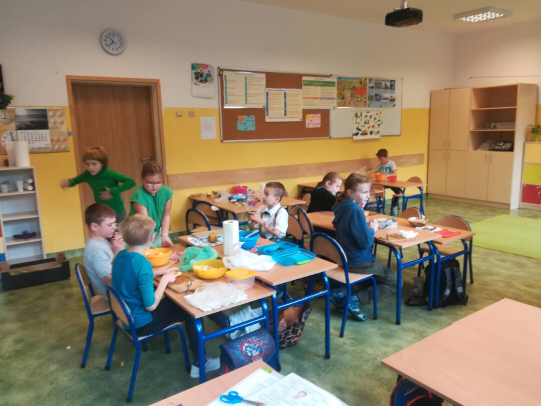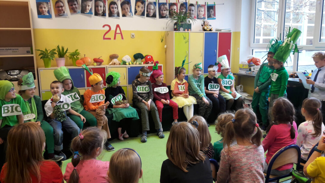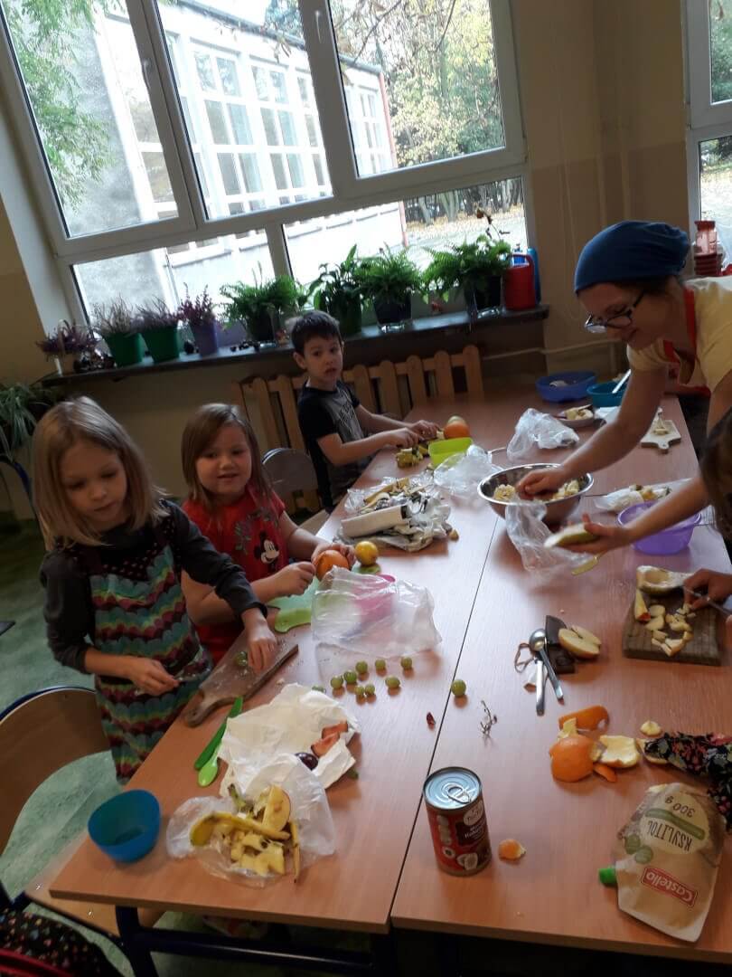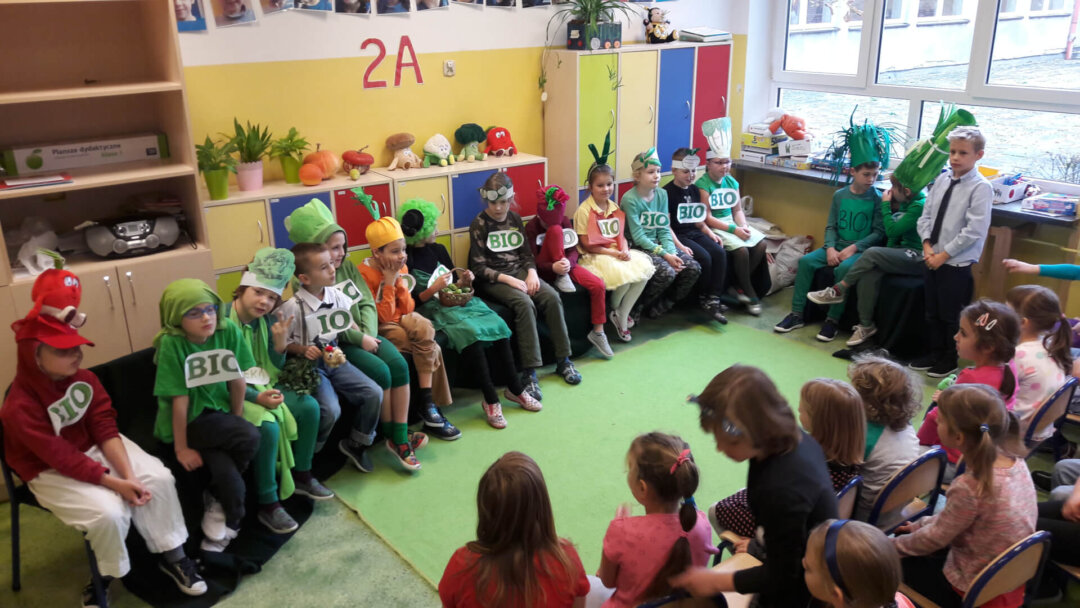 Celem programu jest uświadomienie dzieciom wpływu odpowiedniego żywienia na ich zdrowie. A nic tak nie uczy jak działanie! Pierwsze zajęcia poświęcone były PIRAMIDZIE ŻYWIENIA. Dzieci nie tylko słuchały i rozmawiały na ten temat, przede wszystkim same zbudowały „schody zdrowia”. Drugie zajęcia rozpoczęliśmy przygotowanym przez uczniów klasy 2a występem pt. „Na straganie”. Inscenizacja była wspaniała! Drugoklasiści to świetni aktorzy! Później każdy aktor opowiedział o granym przez siebie warzywie. Dzięki temu dowiedzieliśmy się ile cennych witamin i minerałów zawierają jarzynki 🙂 Następnie nadszedł czas działania! W klasach przygotowaliśmy pyszne