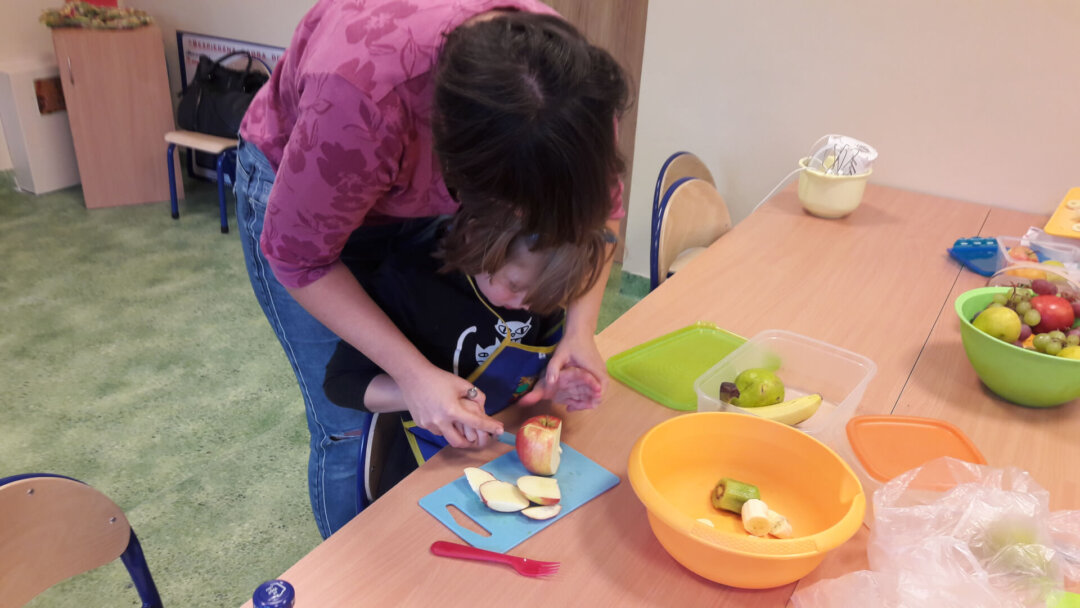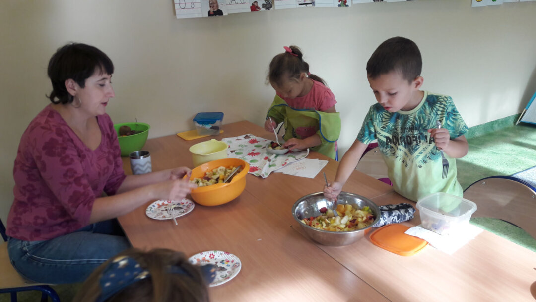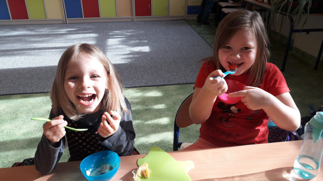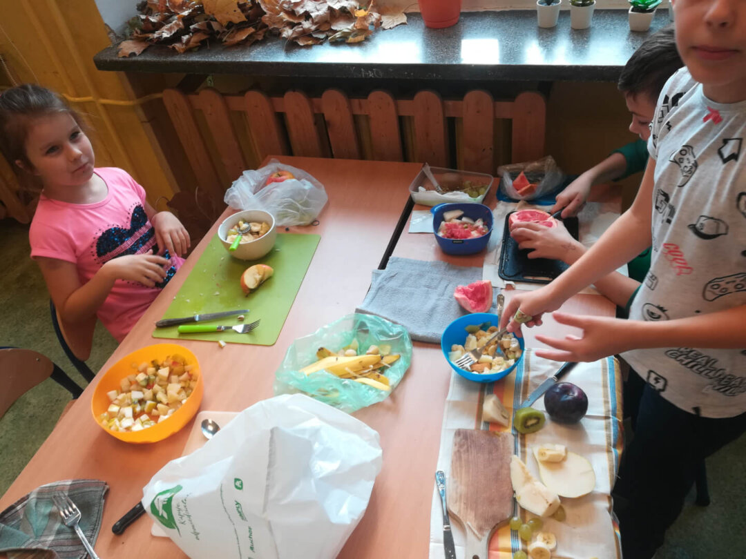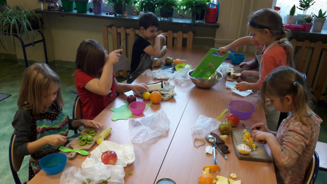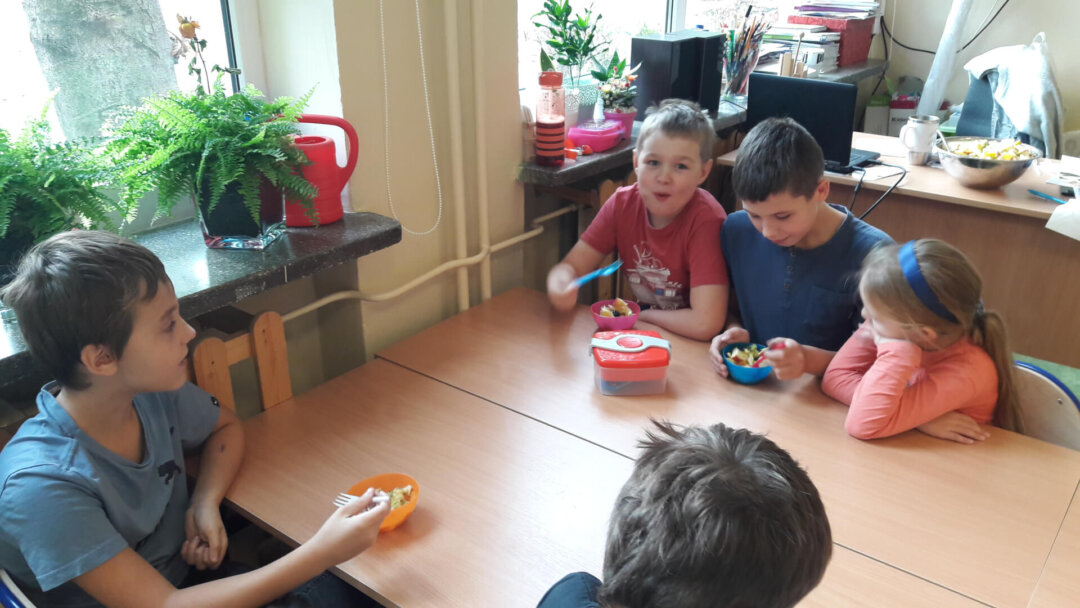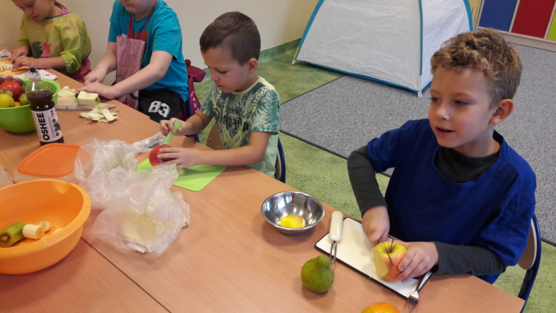 Celem programu jest uświadomienie dzieciom wpływu odpowiedniego żywienia na ich zdrowie. A nic tak nie uczy jak działanie! Pierwsze zajęcia poświęcone były PIRAMIDZIE ŻYWIENIA. Dzieci nie tylko słuchały i rozmawiały na ten temat, przede wszystkim same zbudowały „schody zdrowia”. Drugie zajęcia rozpoczęliśmy przygotowanym przez uczniów klasy 2a występem pt. „Na straganie”. Inscenizacja była wspaniała! Drugoklasiści to świetni aktorzy! Później każdy aktor opowiedział o granym przez siebie warzywie. Dzięki temu dowiedzieliśmy się ile cennych witamin i minerałów zawierają jarzynki 🙂 Następnie nadszedł czas działania! W klasach przygotowaliśmy pyszne