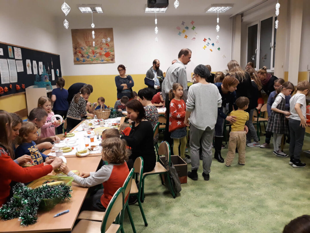 Pierwszy raz pozwoliliśmy w przygotowania zaangażować się także rodzicom. Podczas zorganizowanych warsztatów świątecznych razem z dziećmi mogli stworzyć własne wieńce, bombki i witraże.