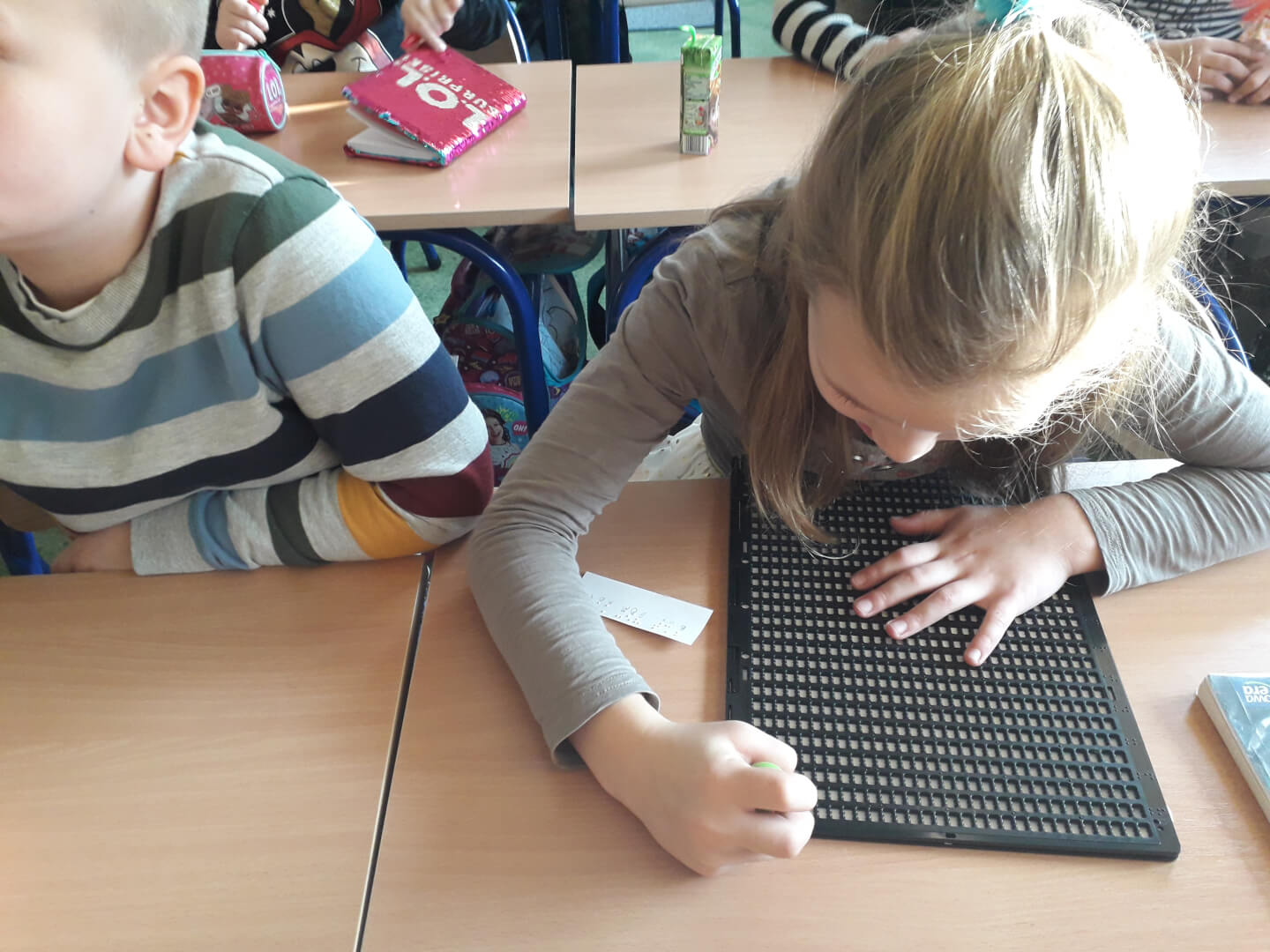 · uczniowie kl. 2a dowiedzieli się czym jest showdown i goalball czyli dyscypliny sportowe dla osób niewidomych i słabowidzących. Mieli także okazję przekonać się jak to jest wykonywać codzienne czynności bez użycia wzroku oraz odczytywać alfabet Braille’a. Na koniec nauczyli się jak pomagać osobom z dysfunkcją wzroku