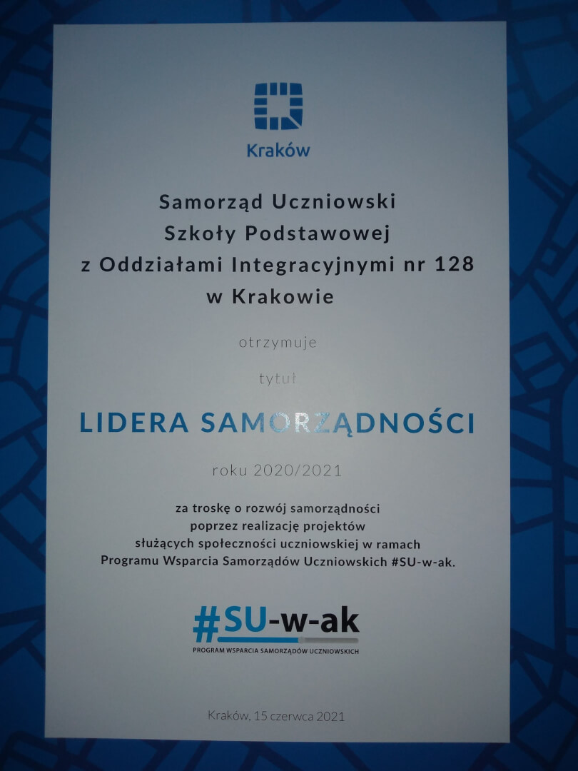 Miło nam poinformować, że znaleźliśmy się w elitarnym gronie pięciu szkół wyróżnionych w tym roku za troskę o rozwój samorządności przez Urząd Miasta Krakowa. Dyplom podczas gali finałowej odebrały uczennice ósmej klasy, które najaktywniej pracowały w ramach Programu Wsparcia Samorządów Uczniowskich #SU-w-ak. To dzięki nim udało nam się zrealizować kilka ciekawych projektów. Brawo dziewczyny!