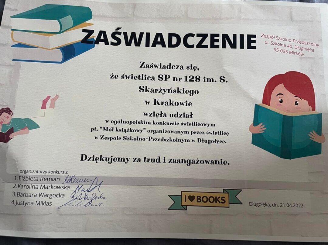 Dodatkowo, uczennicy klasy 1a, Zuzannie Poradzie udało się zdobyć wyróżnienie w Ogólnopolskim Konkursie Świetlicowym,(konkurs literacki i plastyczny) organizowanym przez ZSP w Długołęce, pt.,,Mol książkowy”.