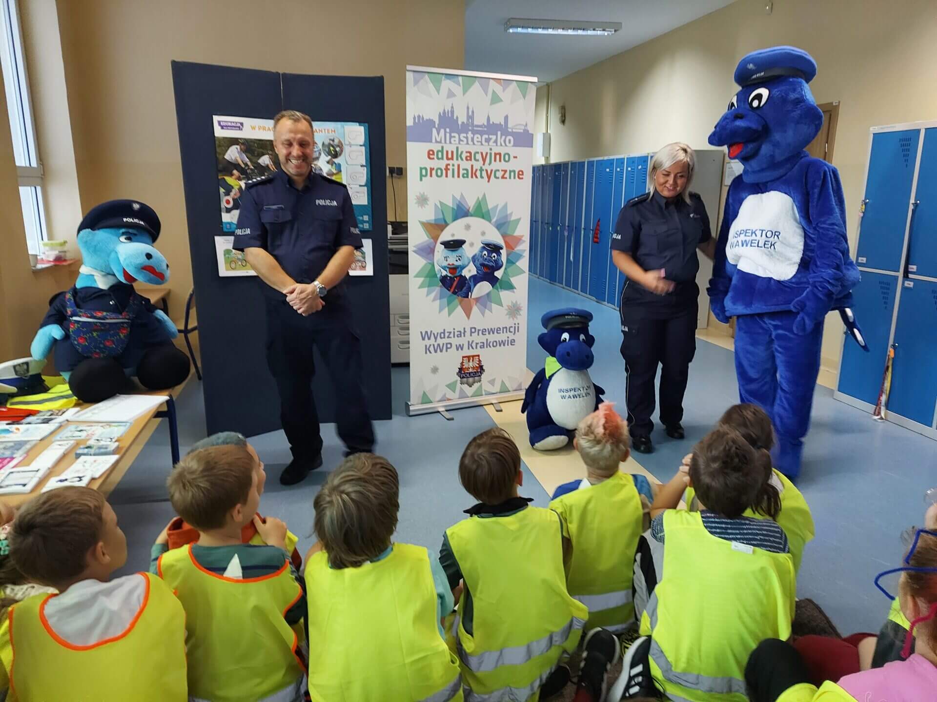 27 września policjanci z Wydziału Prewencji Komendy Wojewódzkiej Policji w Krakowie przeprowadzili zajęcia edukacyjno-profilaktyczne w klasach trzecich naszej szkoły. Spotkanie było dla dzieci niezwykle interesujące i pouczające. Uczniowie przypomnieli sobie zasady szeroko rozumianego bezpieczeństwa. Okazało się, że dużo już wiedzą, ale zawsze warto co jakiś czas taką wiedzę odświeżyć. Wielką atrakcją było oglądanie prawdziwego radiowozu, ale największą odwiedziny Inspektora Wawelka 🙂 jeszcze raz dziękujemy naszym policjantom i policjantkom za ich pracę i za zajęcia!