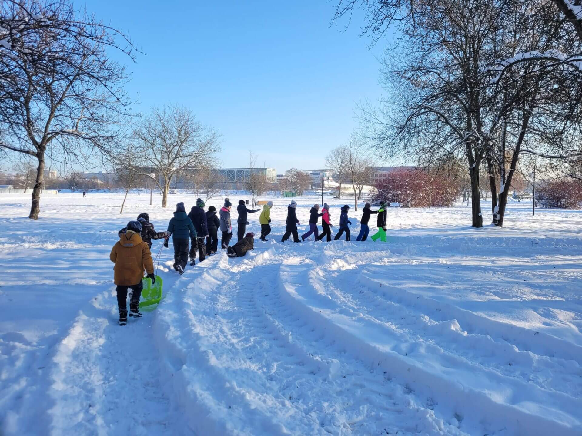 Zabawy zimową porą w ramach w-fu w 3b. Sanki, lepienie bałwana czy szukanie tropów, za to właśnie dzieci lubią zimę.