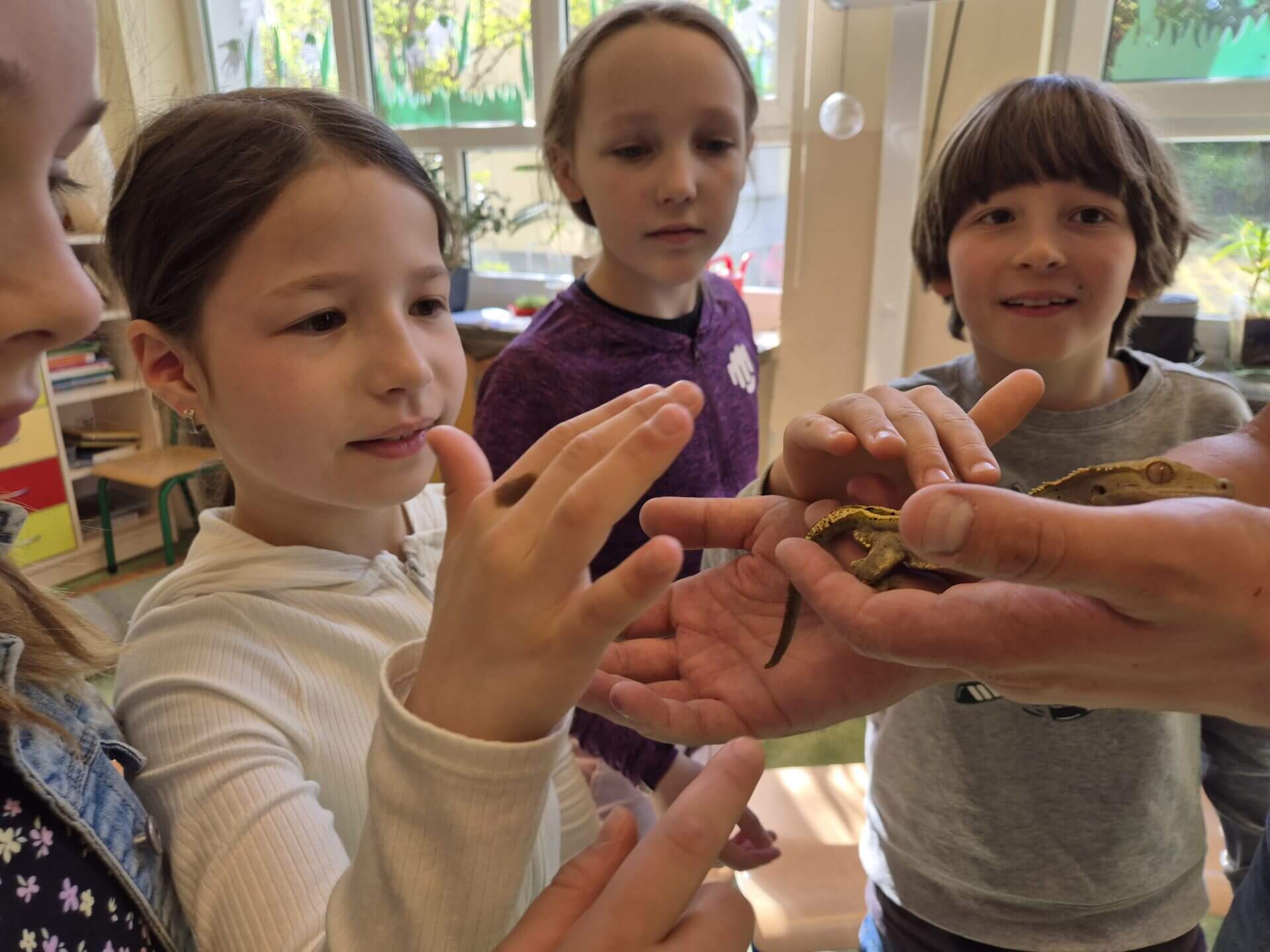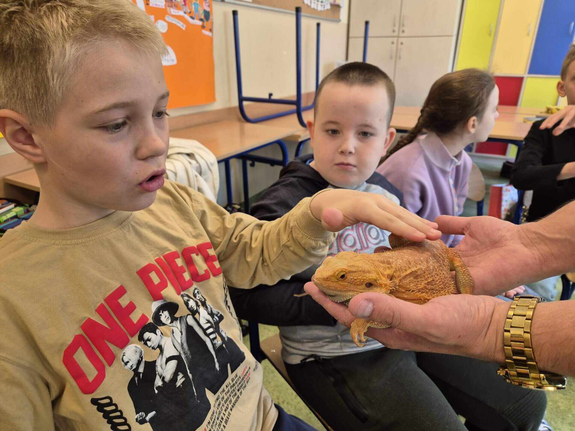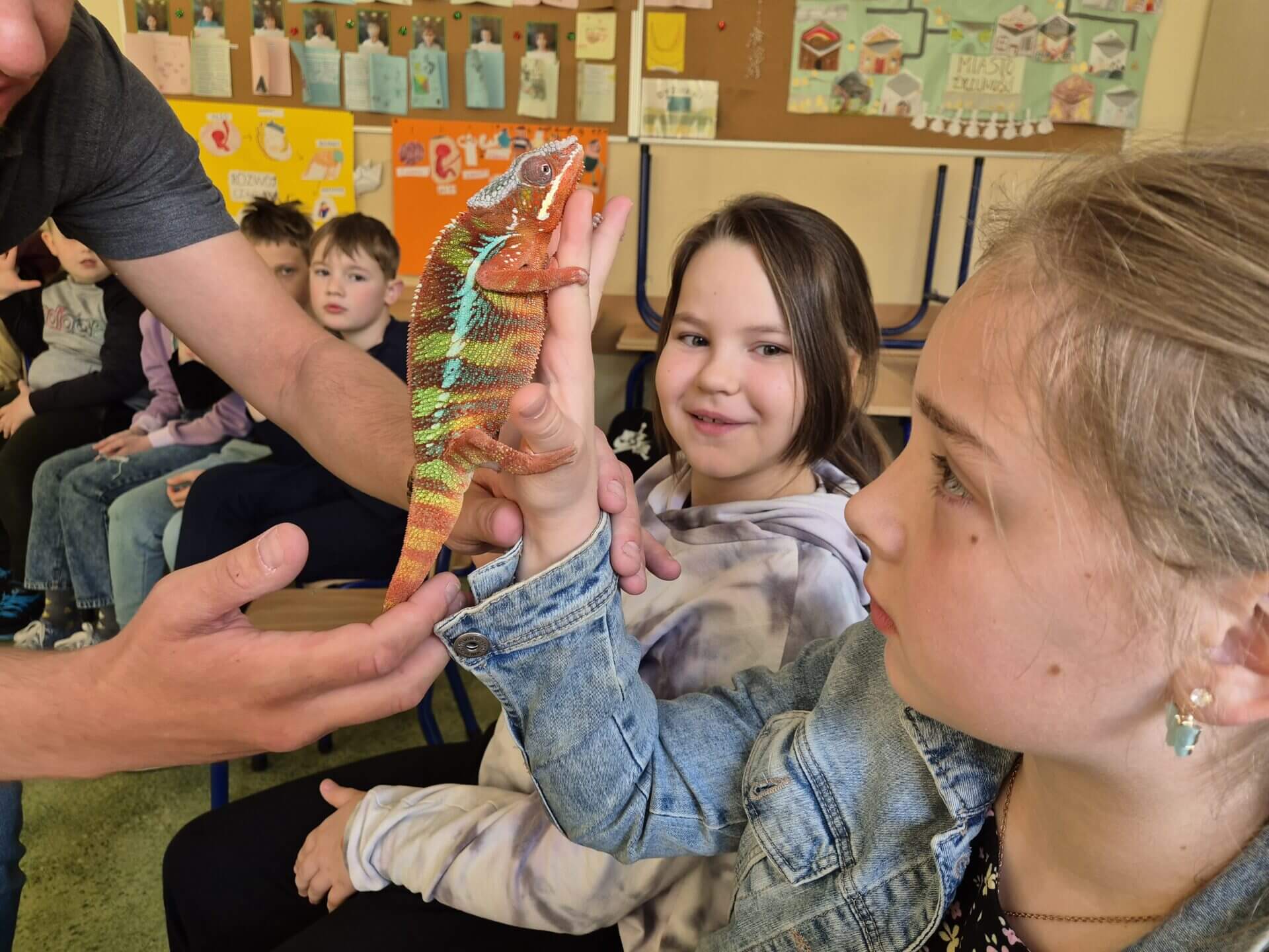 19 kwietnia w klasie 3a odbyła się niezwykła, żywa lekcja przyrody. Dzięki naszej koleżance i jej Rodzicom przyszedł do nas pan z Zooventura – edukacja. Przyniósł ze sobą niesamowite zwierzęta, o których nam opowiedział i pozwolił wziąć na ręce lub na szyję :). Mieliśmy okazję poznać m.in. Kameleona Filipa, węża Krzysia, żółwia Orzeszka i tarantulę Teklę. Okazaliśmy się bardzo odważni. Niesamowita lekcja!