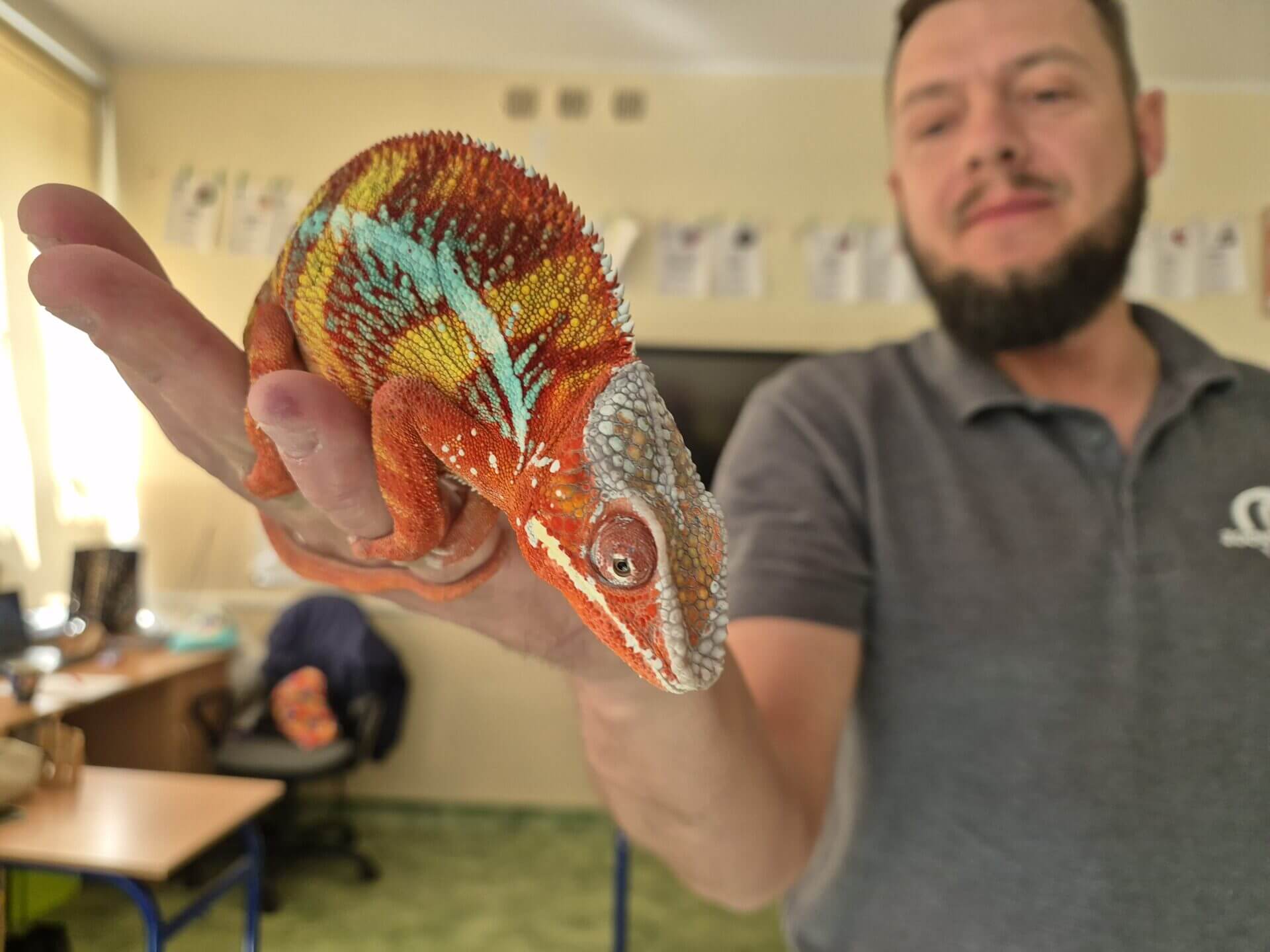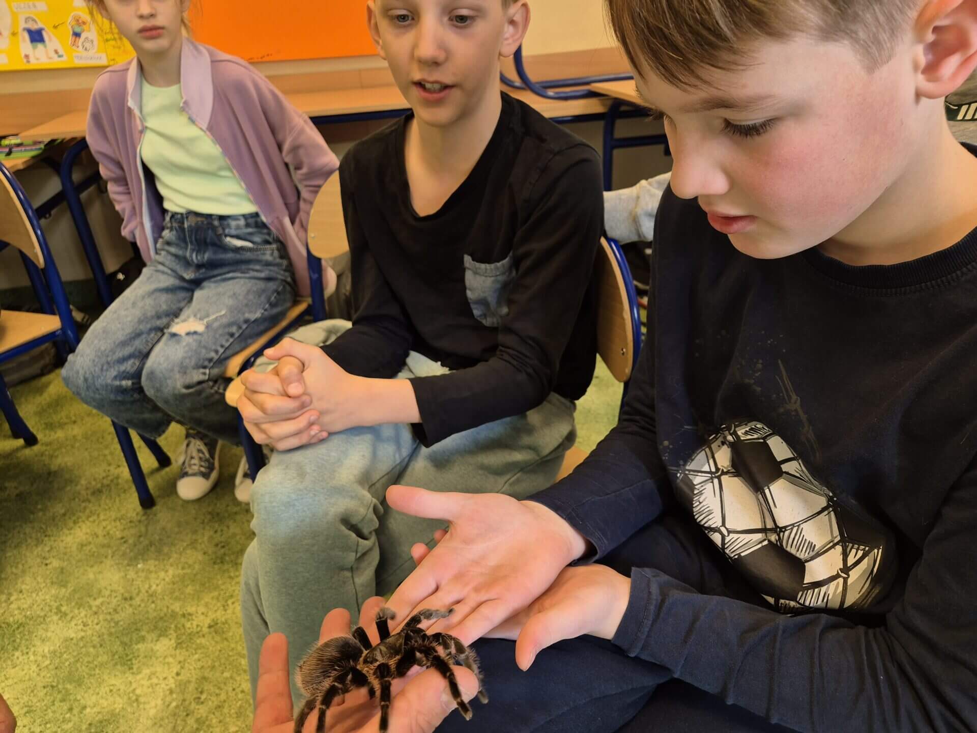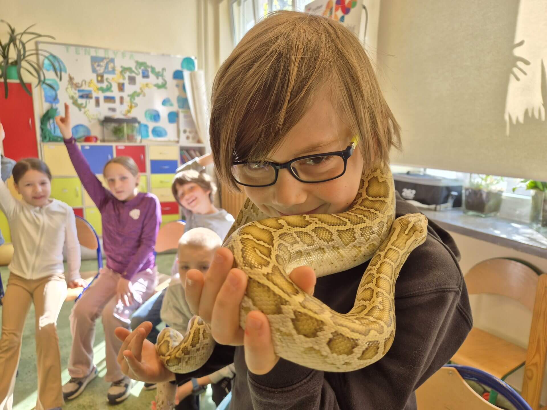 19 kwietnia w klasie 3a odbyła się niezwykła, żywa lekcja przyrody. Dzięki naszej koleżance i jej Rodzicom przyszedł do nas pan z Zooventura – edukacja. Przyniósł ze sobą niesamowite zwierzęta, o których nam opowiedział i pozwolił wziąć na ręce lub na szyję :). Mieliśmy okazję poznać m.in. Kameleona Filipa, węża Krzysia, żółwia Orzeszka i tarantulę Teklę. Okazaliśmy się bardzo odważni. Niesamowita lekcja!
