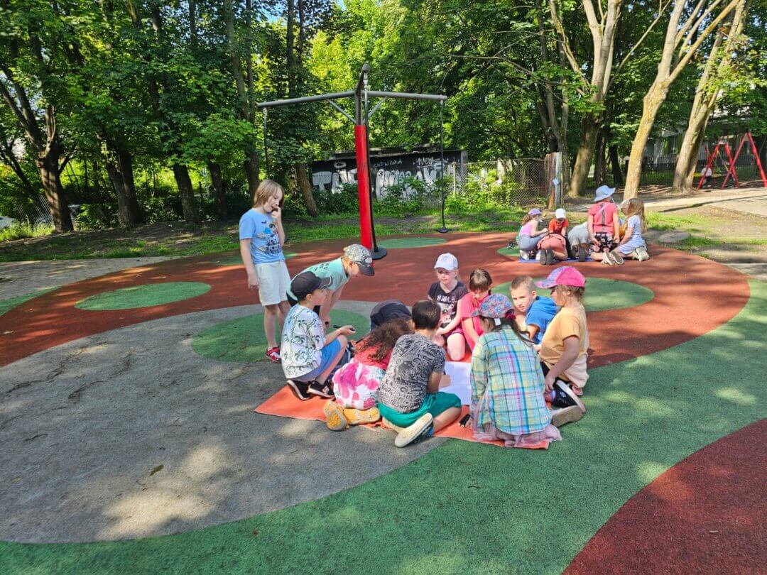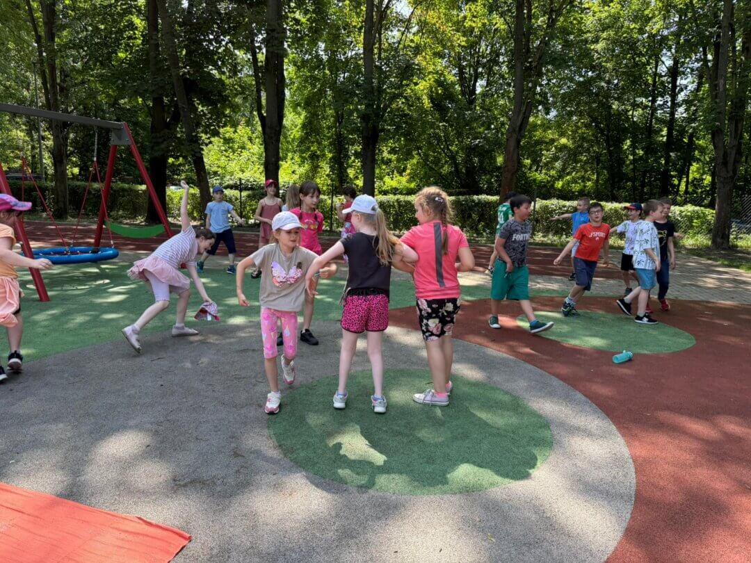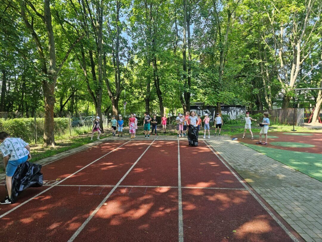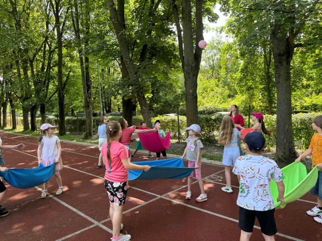 Klasa 2a Dzień Dziecka spędziła bardzo aktywnie na świeżym powietrzu. Dzieci podzieliły się na dwa zespoły i rywalizowały ze sobą w różnych konkurencjach: bieg w workach, gra w balona, klasy, szukanie i rozwiązywanie zagadek. Każda grupa przygotowała swój herb i okrzyk i choć rywalizowały między sobą, to na końcu był remis. Zwieńczeniem atrakcyjnego dnia był słodki poczęstunek i małe upominki 🙂