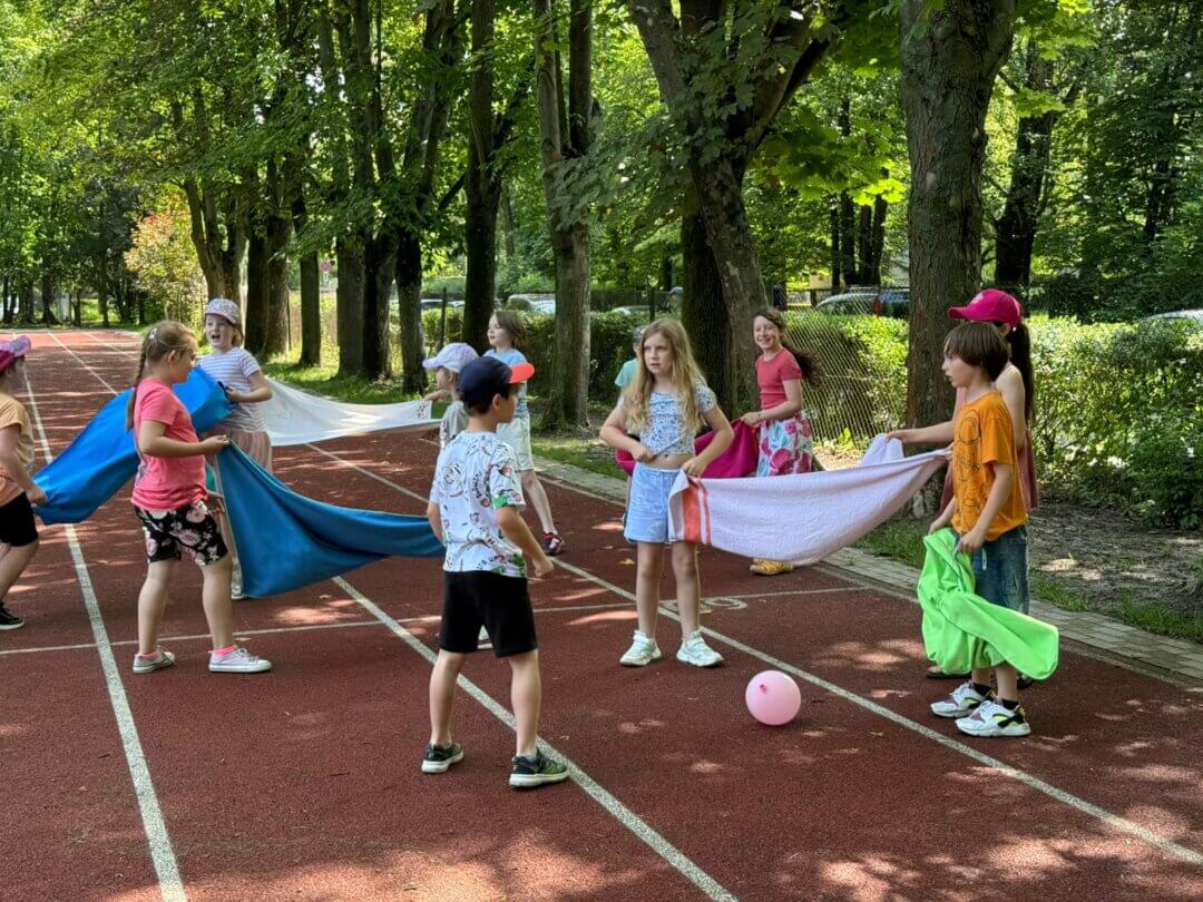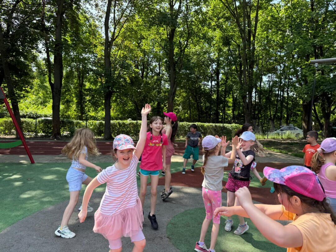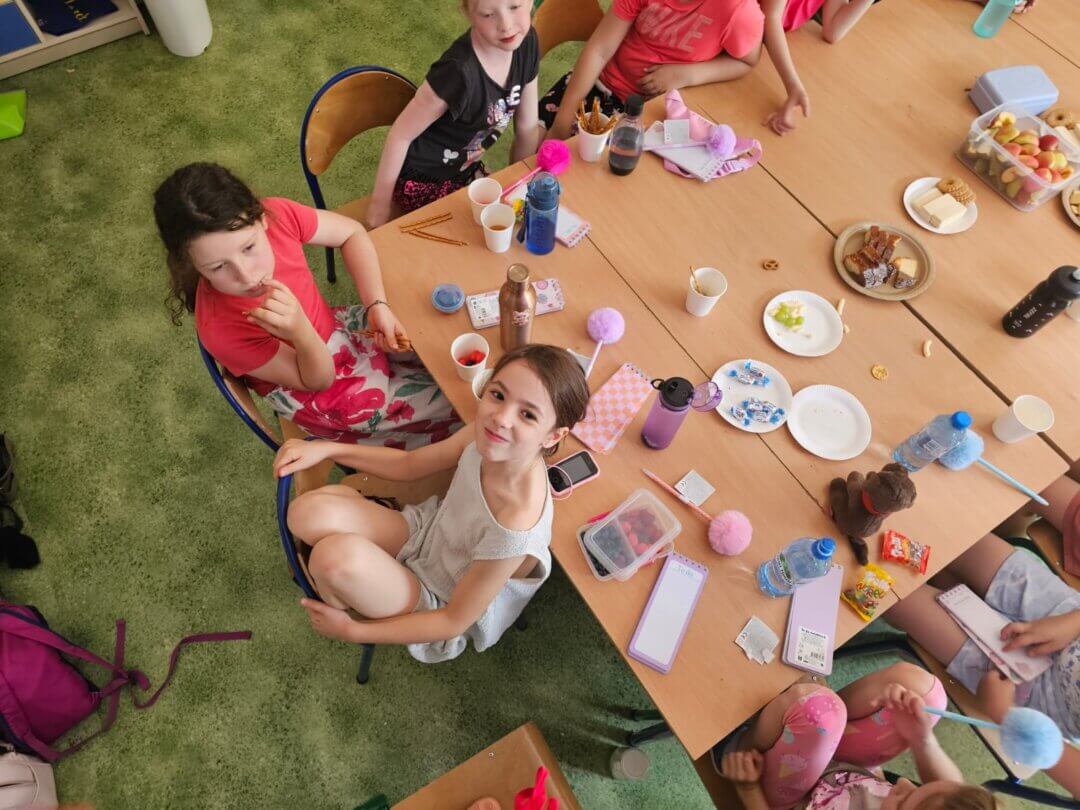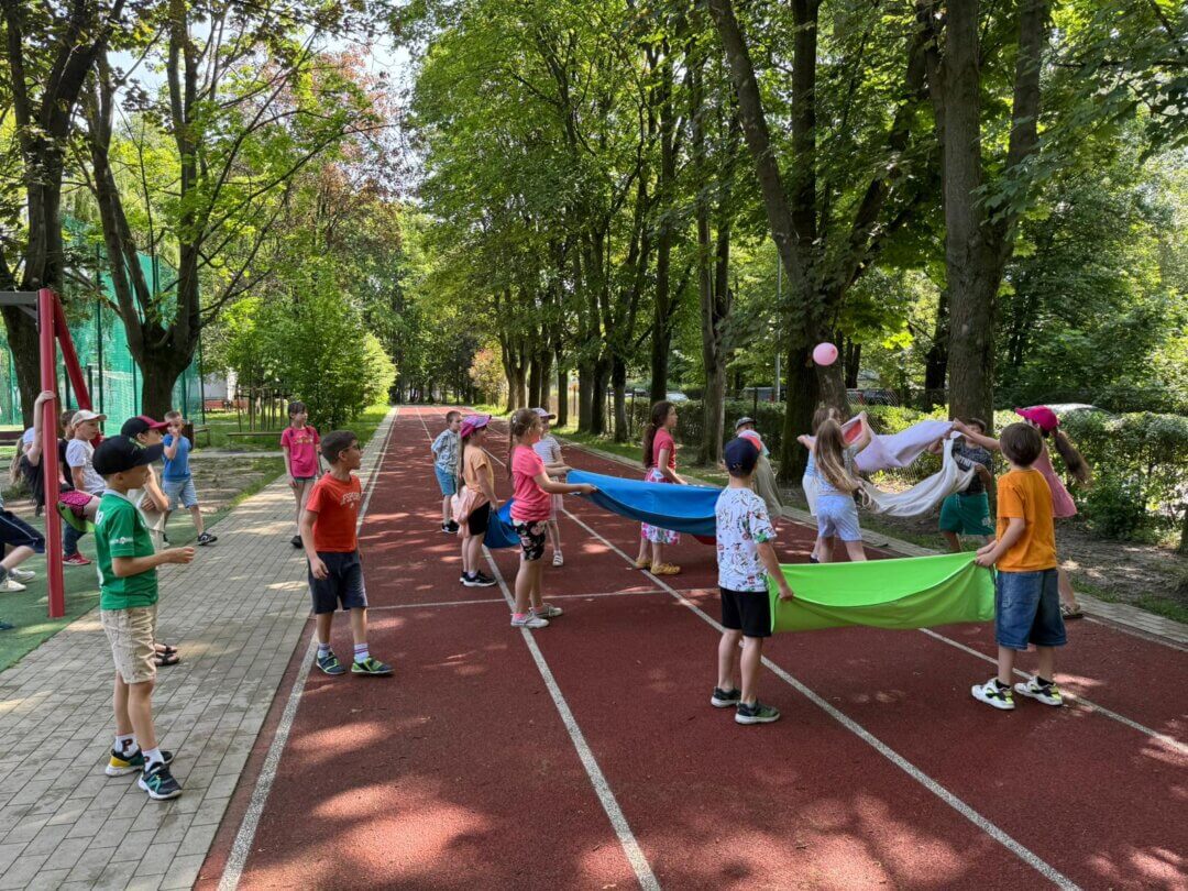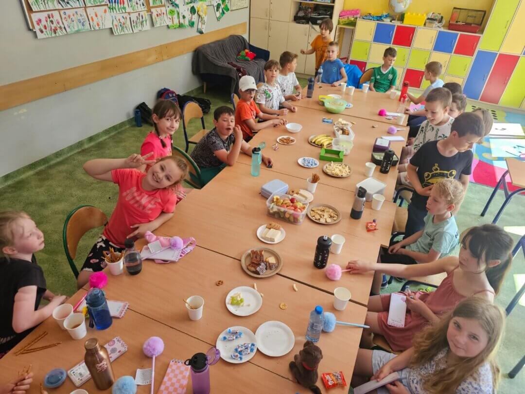 Klasa 2a Dzień Dziecka spędziła bardzo aktywnie na świeżym powietrzu. Dzieci podzieliły się na dwa zespoły i rywalizowały ze sobą w różnych konkurencjach: bieg w workach, gra w balona, klasy, szukanie i rozwiązywanie zagadek. Każda grupa przygotowała swój herb i okrzyk i choć rywalizowały między sobą, to na końcu był remis. Zwieńczeniem atrakcyjnego dnia był słodki poczęstunek i małe upominki 🙂